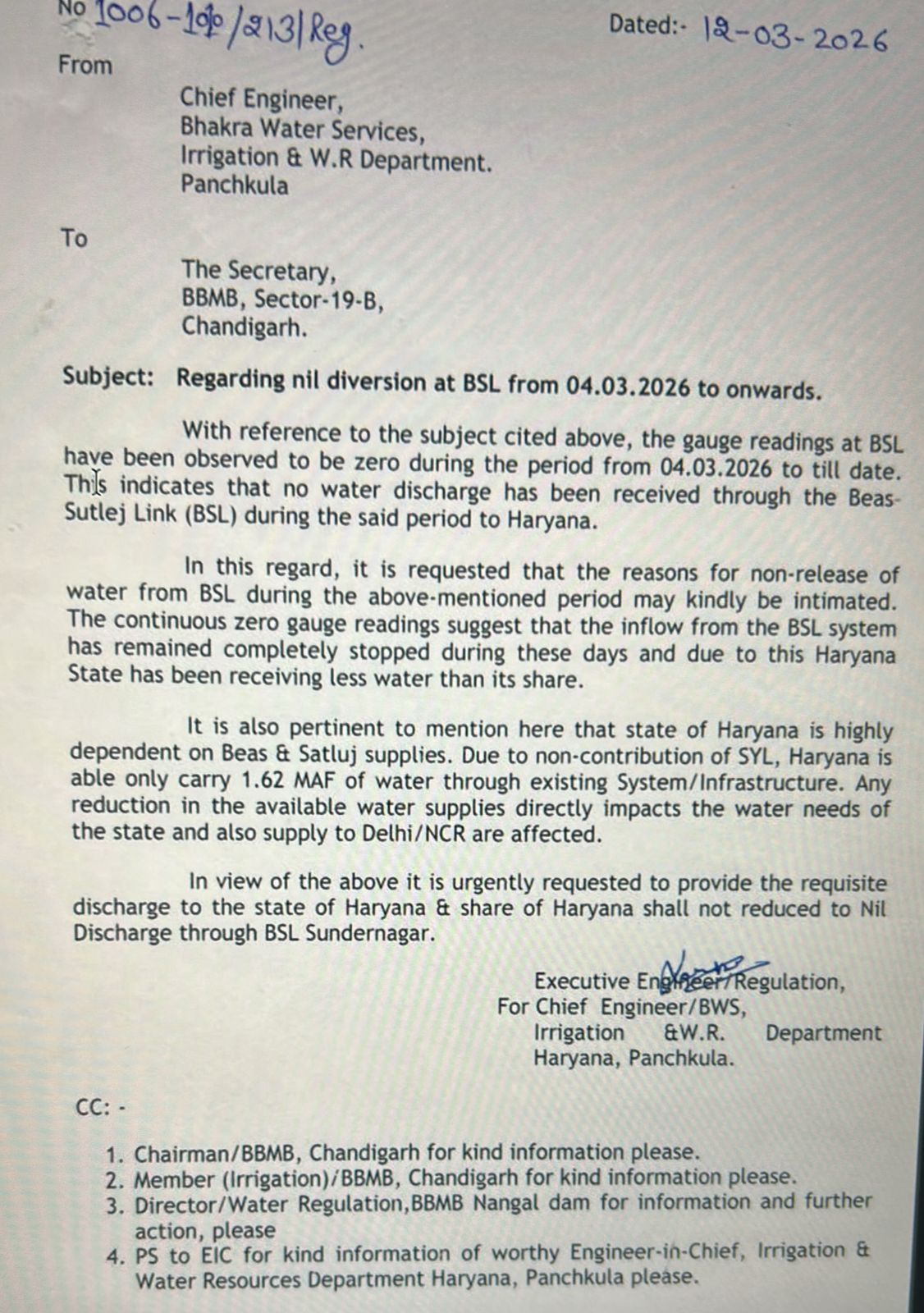 चंडीगढ़ से सामने आए एक अहम घटनाक्रम में हरियाणा को ब्यास-सतलुज लिंक (BSL) के जरिए मिलने वाली पानी की सप्लाई 4 मार्च 2026 से पूरी तरह ठप हो गई है। सिंचाई एवं जल संसाधन विभाग के मुख्य अभियंता ने इस गंभीर स्थिति को देखते हुए Bhakra Beas Management Board को पत्र लिखकर कारण बताने और तत्काल पानी छोड़ने की मांग की है।विभाग के अनुसार, 4 मार्च से लगातार गेज रीडिंग शून्य दर्ज की जा रही है, जिससे स्पष्ट है कि इस अवधि में हरियाणा को BSL के माध्यम से कोई पानी नहीं मिला। इससे राज्य को अपने हिस्से से कम पानी मिलने की आशंका बढ़ गई है।