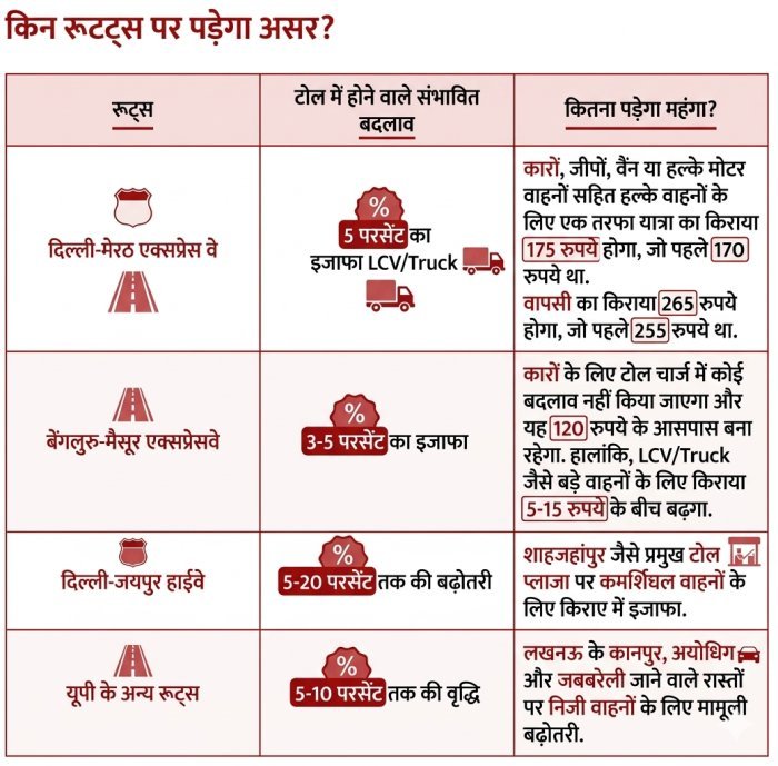 विभिन्न रूटों पर कितना बढ़ेगा टोल?