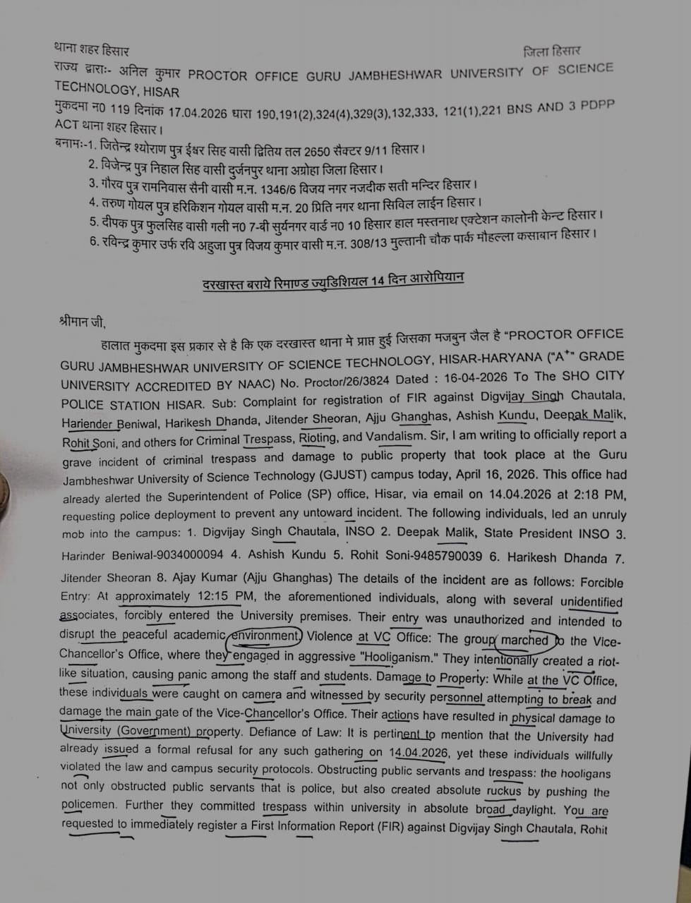दरअसल, पूरा मामला गुरु जंभेश्वर यूनिवर्सिटी में हुए हंगामे से जुड़ा है। जजपा की ओर से सम्मेलन की मांग की जा रही थी, इसी दौरान छात्रों ने वीसी ऑफिस के गेट तोड़ दिए और गमले फेंके। पुलिस और छात्रों के बीच झड़प भी हुई। हालात बिगड़ते देख वीसी नरसीराम बिश्नोई पीछे के गेट से निकल गए। बाद में वीसी ने इस घटना को सुरक्षा में बड़ी चूक बताया।