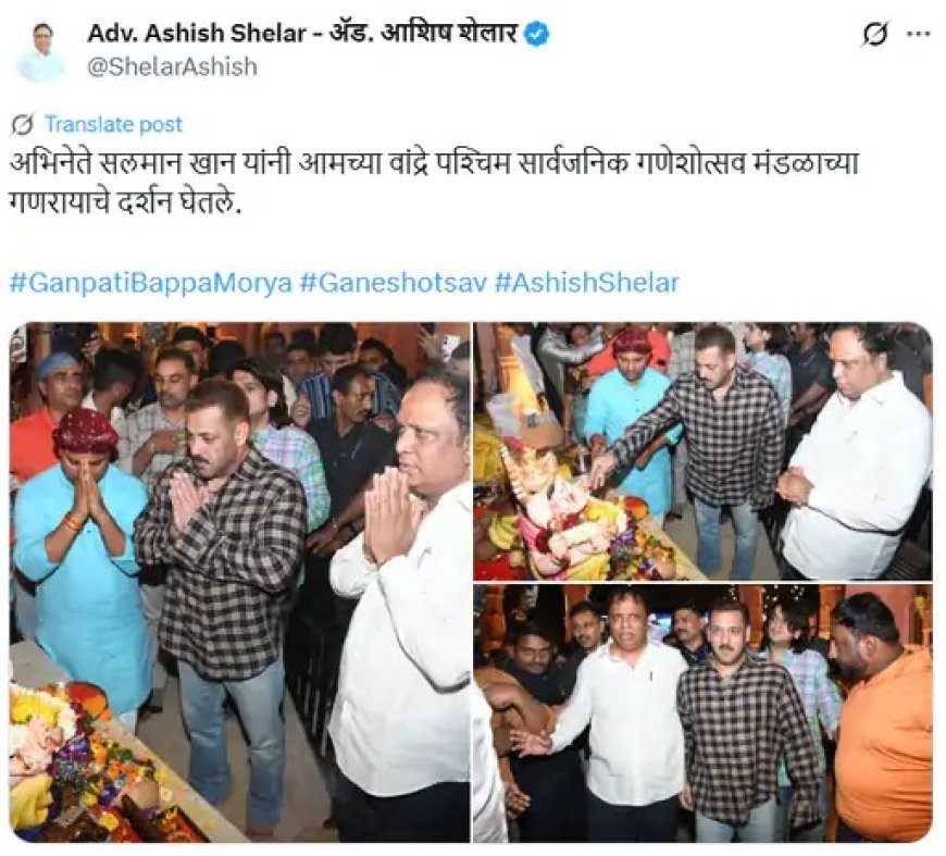मिनिस्टर आशीष शेलार ने अपने ऑफिशियल X (पहले ट्विटर) अकाउंट पर सलमान खान के दर्शन और फोटो शेयर किए। पोस्ट में लिखा गया कि 'एक्टर सलमान खान हमारे बांद्रा वेस्ट पब्लिक गणेषोत्सव कमेटी के गणपति के दर्शन करने आए हैं।'